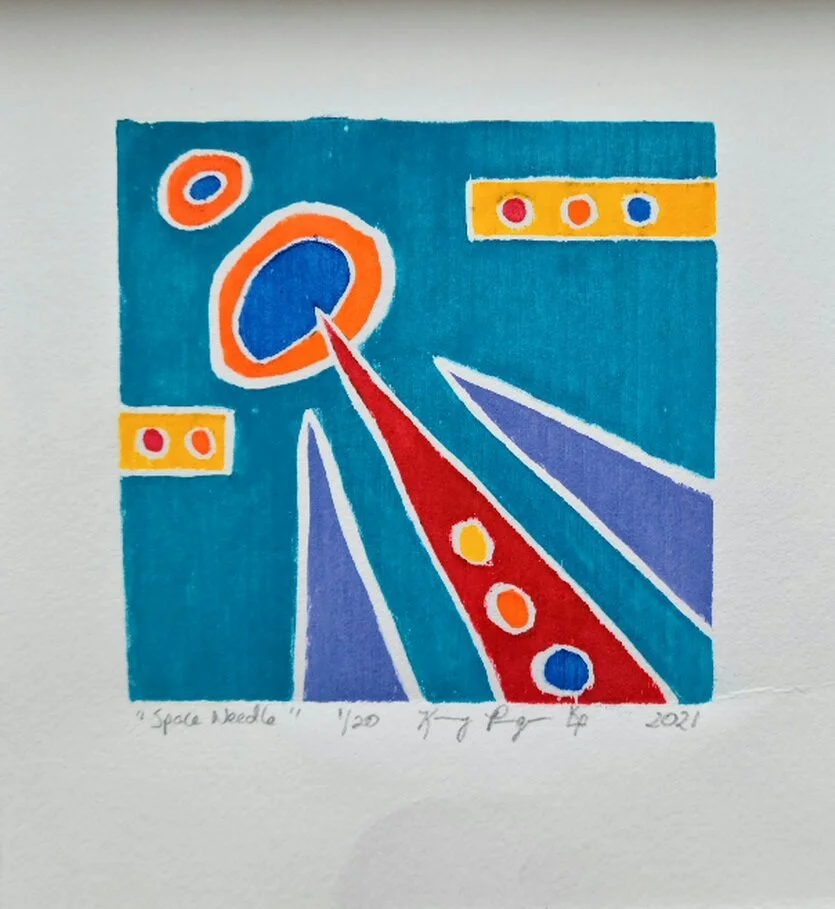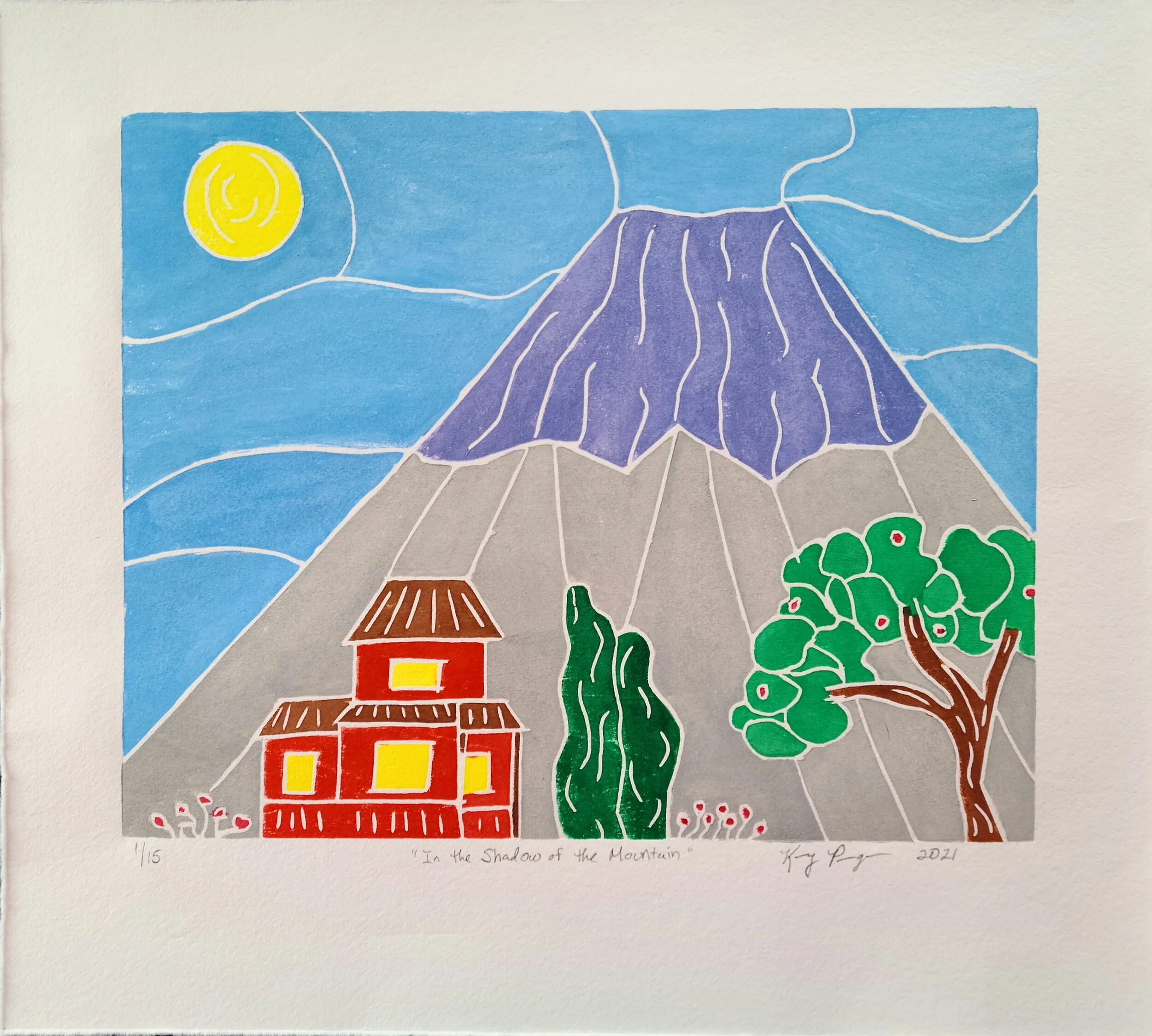 My process uses a wooden spoon and I make all my prints by hand using a water-based printing ink. I typically apply three coats of ink to each section of my block to get the color saturation that I prefer for my prints. Most of my prints are abstract but occasionally I will use subject matter that is more realism-based.
